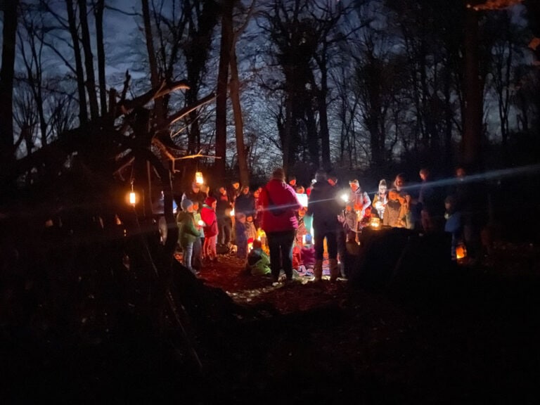 Am Waldplatz lauschten wir einer Geschichte über eine Laterne, die ihr Licht teilte – ein Symbol für Nächstenliebe und Gemeinschaft. Anschließend entzündeten die Kinder aus einer Flamme ihre Kerzen, die gemeinsam einen leuchtenden Kreis bildeten. Das vertraute Waldstück wurde so zur zauberhaften Bühne für Gesang und Lichterglanz.
